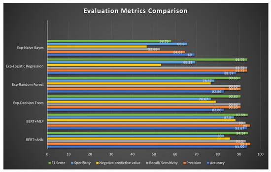 Hence, it can be derived that the variants of BERT used in the research work had superior performance to the base model; BERT + ANN performed best in terms of explainability, and BERT + MLP performed best overall compared to traditional models such as logistic regression, KNN, naïve Bayes, decision trees, and random forests.