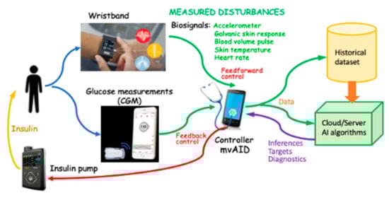 Fully-automated AID systems (Figure 1) necessitate the detection of food consumption and estimation of the carbohydrate content of the meal and the detection of PA, classification of its type (such as aerobic, resistance, or interval training), and estimating its intensity and duration [60,61,62,63,64]. This can only be achieved by a multivariable approach where physiological data from wearable devices such as wristbands are integrated with CGM and insulin infusion information to capture the metabolic state of the individual and compute the optimal insulin dose to be infused by the pump [62]. The model predictive control (MPC) approach has been demonstrated as the most effective type of control algorithm for AID systems [26,65,66]. It necessitates the estimation of the future BGC to determine the optimal insulin dose to be infused by the pump. The accuracy of future BGC estimates increases when future disturbances are estimated and included in predicting future BGC excursions [19]. ML algorithms can analyze glucose and insulin data to determine the insulin dose requirements and analyze historical data to identify trends and patterns that can be used to anticipate events and proactively make insulin dose adjustments [19].