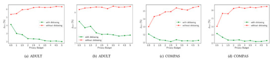 Various privacy protection approaches are proposed to protect the privacy of sensitive data including multiparty computation (MC), differential privacy (DP), local differential privacy (LDP) and federated learning (FL). Such privacy mechanisms are widely deployed in medical analysis applications. There is currently limited research on the intersection of privacy and fairness in ML. For example, with regards to the problem of fairness under LDP, we can observe the experiment results on two mainstream fairness datasets (ADULT [84], COMPAS [85,86]) and conclude that stronger privacy guarantee requirements lead to worse fairness performance for debiasing models such as adversarial debiasing (Figure 2). Therefore, there is a trade-off between the debiasing model and the LDP privacy mechanism. More research is needed for the direction of private and fair ML.