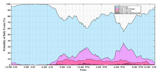 The probabilities of meals, physical activity events, or their concurrent presence during one day (24-h period) were obtained by analyzing 15 months of CGM, insulin pump, meal, and physical activity data collected from a randomly selected person with T1D from the Tidepool dataset (Figure 4) illustrate that while there are peak times for meals and exercise, their high probabilities of occurrence are spread over time windows ranging from 1 to 3 h.