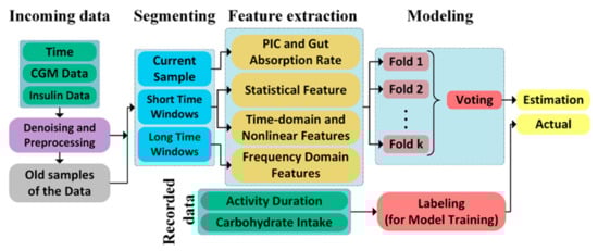 For the detection and classification of events, the CGM values and insulin pump data are preprocessed and stacked with the past recorded data. All samples are segmented into three different time windows: the current samples are used for model-based feature extraction, two-hour window of the past data are used for statistical and nonlinear feature variables, and past day samples of the data are used for the frequency domain features. Redundant feature variables are identified and eliminated by a two-step feature selection procedure. First, the deviance statistic test is performed to filter out features with low significance. Then, the training split of all datasets is used in the wrapper feature selection strategy to maximize the accuracy of the classifier in estimating meal and exercise events. Voting and k-fold cross validation are used to assign the current state to one of the four classes: “Meal and Exercise” (M and E), “no Meal but Exercise” (E), “no Exercise but Meal” (M), “neither Meal nor Exercise” (No M and E).