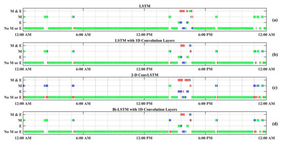 Figure 8 displays a random day selected from the test data to compare the effectiveness of various RNN models in detecting meal and exercise disturbances. Among four possible realizations for the occurrence of events, detecting joint events, Class M and E is more challenging as it usually shows overlaps with Class M and Class E. Several reasons contribute to this challenge. Many people with T1D usually have a small snack before and/or after exercise sessions. Also, exercise alone and exercise and snack together are less frequent than sedentary state and meal consumption, and consequently, there is less information on Class M and E. Furthermore, the AID systems used by subjects record automatically only CGM and insulin infusion values, and meal and physical activity sessions needed to be manually entered into the device, at times an action that may be forgotten by the subject.