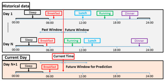 Following the detection of meal and exercise events in historical data, we combine the knowledge in historical data with real-time streaming information to determine the most likely behavior pattern for the subject, and incorporate the estimated behavior pattern in the multivariable AID system for improved decision-making. This improvement is illustrated by simulations conducted with the mvAID connected to a multivariable simulator (mGIPsim) [99]. mGIPsim is a novel software enabling the in silico testing of advanced mvAID systems that improve glycemic control by supplementing the CGM data with additional physiological measurements. The mGIPsim software has descriptions of meals, insulin administration, and physical activities as inputs, and provides glucose and insulin concentrations and physiological variables as outputs for use by nvAID algorithms. mGIPsim can simulate patient behavior for up to one year with random daily variations in meal and physical activity characteristics within ranges specified by the user. It has a heterogenous virtual synthetic patient population that is representative of the actual patient population. mGIPsim is used to generate data for several days in response to daily meal and exercise events. This historical data set is used to extract patterns of behavior for each virtual subject. On the current day, the data generated up to the current time is compared with all patterns of behavior of that subject, and the pattern that matches the most to the current day is selected to provide future meal and exercise information (Figure 9). This pattern information is used by the MPC to incorporate future potential meal and exercise events in the prediction of future glucose values and compute optimal insulin infusion to minimize the deviation of the predicted glucose concentration from the desired glucose concentration.