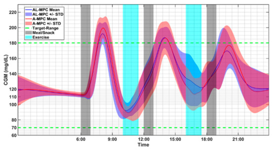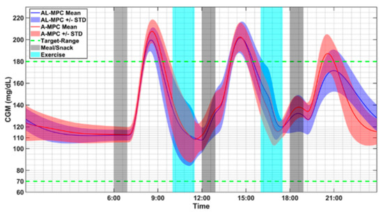The improvement achieved by this approach is illustrated by two figures that compare the performance of the AID control systems. The mvAID with an adaptive glucose concentration model is denoted by A-MPC, and the controller that learns the patterns of behavior is denoted by AL-MPC in Figure 10 and Figure 11. The first figure (Figure 10) compares the performances on day 30 of the simulation period for the two algorithms, by reporting the mean glucose concentrations and their standard deviations for all 20 virtual subjects simulated. AL-MPC is able to reduce the maximum glucose concentrations without increasing the risk for hypoglycemia. Figure 11 illustrates the performance of the two algorithms for one subject over the 30-day simulation period. Again, AL-MPC is able to reduce the maximum glucose concentrations without increasing the risk for hypoglycemia. The number of predicted hypoglycemic events decreased for the 30-day simulation period from 92 to 75 with AL-MPC (hypoglycemia did not occur since based on the prediction rescue carbs are consumed by the subjects) and the average of total daily injected insulin (U) remained the same (39.5 U) [19].