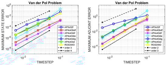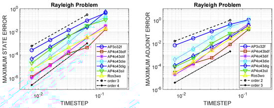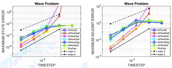 and the optimal control is . The key observation here is that the eigenvalues of the Jacobian of the right-hand side in (106)–(111) are and , which requests appropriate step sizes for only the )-stable methods AP4o43bdf and AP4o34dif due to their stability restrictions along the imaginary axis. Indeed, a closer inspection of the stability region of the (multistep) BDF4 method near the origin reveals that is a minimum requirement to achieve acceptable approximations for problems with imaginary eigenvalues and moderate time horizon. For the four-stage AP4o43bdf with step size , this yields and hence for the wave problem considered. A similar argument applies to AP4o34dif, too. Numerical results for the maximum state and adjoint errors are plotted in Figure 4 for . They clearly show that both methods deliver first feasible results for and below only, but then again outperform the other Peer methods. Once again, Ros3wo performs remarkably well. The orders of convergence for the adjoint solutions are one better than the theoretical values, possibly due to the overall linear structure of the boundary value problem.