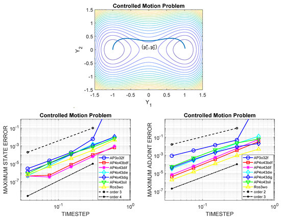The optimal control must accelerate the motion of the particle to follow an optimal path through the total energy field , shown in Figure 3 on the top, in order to reach the final target behind the saddle point. The cost obtained from a reference solution with is , which is in good agreement with the lower order approximation in [1]. Numerical results for the maximum state and adjoint errors are presented in Figure 3 for . Worthy of mentioning is the repeated excellent performance of AP4o43bdf and AP4o43dif, but also the convincing results achieved by the third-order method Ros3wo. All theoretical orders are well observable, except for AP4o43dig, which tends to order three for the state solutions. A closer inspection reveals that this is caused by the second state , while the first one asymptotically converges with fourth order. However, the three methods AP4o43die, AP4o43dig, and AP4o43sil perform quite similar. Observe that AP3o32f has convergence problems for .