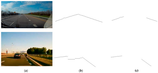 Examples of road edge approximation for the road segment and the original image are shown in Figure 8. The road edge lines are drawn to the intersection point.