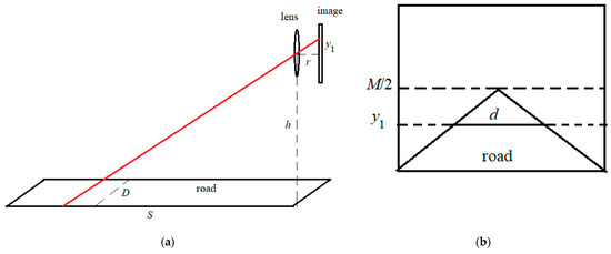 The optical system parameters. (a) Imaging the road in the lens, (b) parameters in the image.