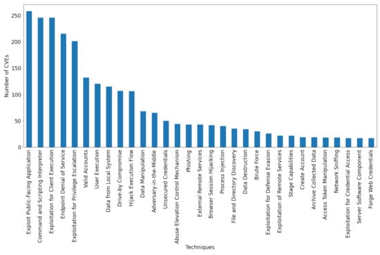 The distribution of CVEs among the 31 considered techniques after applying the threshold.