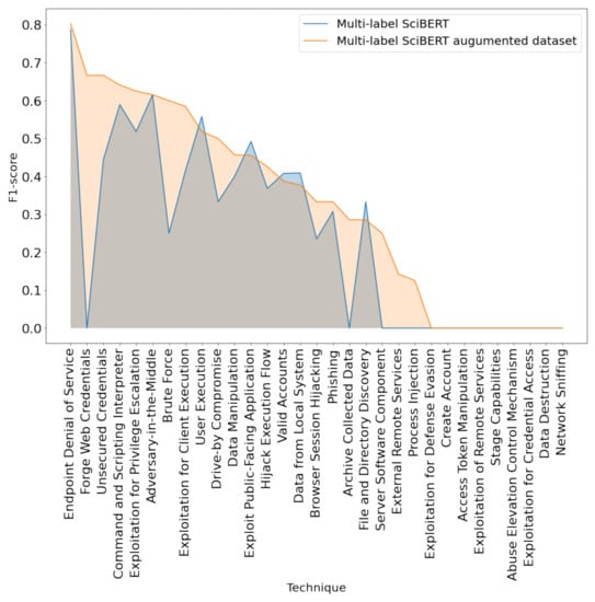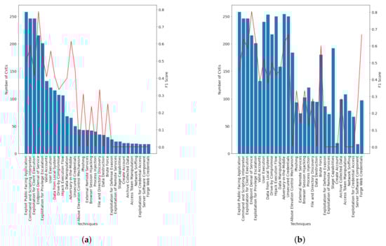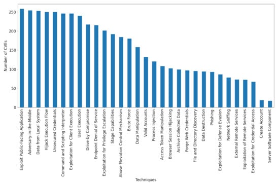 Figure 3 displays the distribution of CVEs per technique after performing the data augmentation. The initial severe imbalance among techniques was scaled down, but still exists, due to the reduced number of particular CVEs for low-frequency techniques.