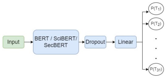 Figure 6 details the proposed model which considers 768-dimensional contextual embeddings from various BERT-based models (i.e., BERT [41], SciBERT [42], and SecBERT [43]) passed through a Dropout layer. The Dropout layer output goes through a Linear layer with 768 input features and 31 output nodes, one for each technique. We considered BCEWithLogitsLoss [44] (the combination of a Sigmoid layer and the BCELoss) as a loss function, the most commonly used for multi-label classification tasks, because each output node reveals the probability of a technique to be tagged for a specific CVE (i.e., the probabilities need to be treated independently).