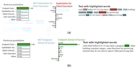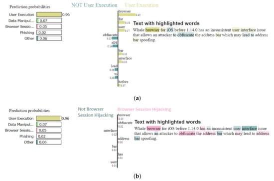 Error #4 is analyzed in detail in Figure 11 to observe insights on how the model associates the features. The word browser is highlighted for both the predicted and the correct label. However, the difference resides in the relevance percentage associated with the word for each label, namely 0.45 for User Execution and 0.03 for Browser Session Hijacking. While the word browser is recognized as being relevant for both labels, the label with the higher percentage is selected. This finding can be associated with the discrepancy between training examples—240 for User Execution, while Browser Session Hijacking has only 102. Thus, the class imbalance affects the model’s capability to recognize the real correlation between features and techniques, and leads the model to a biased decision.