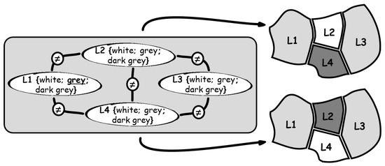 Since a constraint network can be written as a graph (the domains form the nodes, the constraints the arcs), alternative algorithms exploit graph-theoretic methods to reduce the effective search space by enforcing local consistency. A CSP is considered node-consistent if all unary constraints, which limit the value of a single variable, are satisfied. Arc consistency involves binary constraints between domains. Inconsistent values from the further involved domain are then immediately removed for the search [12]. For the example in Figure 1, this means that the value gray can no longer be available for L2 and L4 because L1 is already occupied by gray as input. Path consistency extends this by not only collapsing one domain but removing pairs of values from a constraint [26]. Continuing the above example with pre-collapsed L2 and L4, gray remains as a single consistent value for L3 and leads automatically to the two solutions depicted on the right of the figure, without testing further configurations.