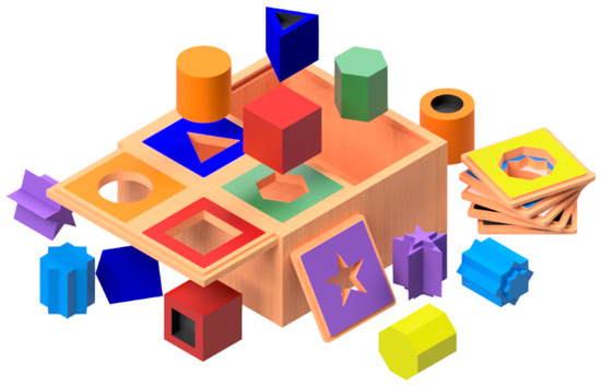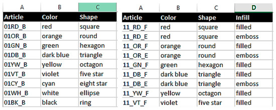 The running example for this article is a configurable toy sorting box for small kids as depicted in Figure 2. The customer first chooses four different slots that are described by article number, shape and color. In a second configuration step, the customer can choose a brick variant for the selected slots, which is described by article number, color, shape and infill (flat, raised, embossed—refer, e.g., to the blue prism bricks in Figure 2).