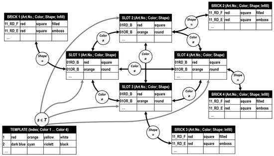As constraints, inequality of SLOT1, SLOT2, SLOT3 and SLOT4 to each other is expressed by bidirectional constraints. The bidirectionality leads to the fact that it later does not matter which value must be set first and which must be propagated afterwards. Additionally, equalities between the slots and the corresponding bricks are introduced. A special feature of the configuration tool is the template definition of four predefined colors. Therefore, an auxiliary domain TEMPLATE is created that contains the template configurations. This constraint is only to be propagated if three slot domains, independently which of them, have an assigned value, otherwise the constraint is relaxed. The resulting constraint network is depicted in Figure 4.
