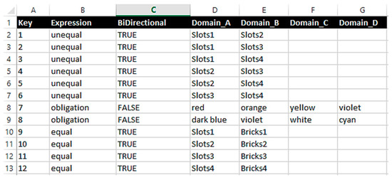 If the spreadsheet contains a constraint with the expression Obligation, the four arguments of the corresponding entry in the constraint list are populated with the four colors as shown in Appendix A, row 251 to 271.