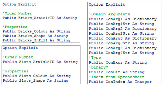 Additionally, as part of the variable declaration, three public class modules iComponent_Bricks, iComponent_Slots and iConstraint are introduced as follows in Figure 8. The first two define the domains and their properties, which are translated to the columns of the dictionaries later. The last class module is the generalized constraint variable. The dictionaries ConArg1 … ConArg4 represent domains that are connected to a constraint, the strings formalize value assignments. This is, e.g., necessary for the template configurations where these arguments contain the four colors. Additionally, the string ConExpr contains the type of the constraint, ConDir, whether it is unary or binary.
