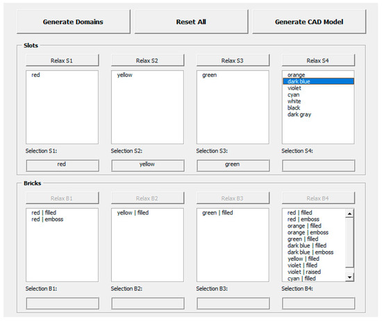 Following the use case diagram from Figure 3, the user form needs to contain control elements for system initialization (command button Generate Domains which starts Sub read_inventory), resetting the whole configuration process (command button Reset All which clears all domains and outputs), as well as choosing and resetting of slots and bricks and generating the CAD model (Figure 9).