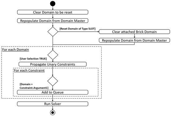 In order to reset an already made choice, Figure 12 describes the activities of the configuration system. At first, the domain to be reset is cleared and repopulated from the domain master. If the reset domain is of type slots, the corresponding brick domain is reset as well. In the next step, all domains that have already been processed by the user and that have a selection are reevaluated by propagating all unary constraints assigned to it. In this way, the according solution set is extended by the selection which has been reset. Afterwards, each constraint from the constraint list is evaluated if the actual domain is the source, i.e., first argument. If so, the constraint is added to the queue. After all domains have been reevaluated, the constraint solver is activated and the reset is completed. The corresponding code is shown in Appendix A, row 372 to 468.