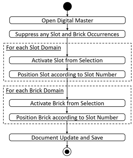 When the user approves his or her choice and initializes the generation of the CAD model, the configuration system opens the digital master for the sorting box assembly, as shown in Figure 13. Afterwards, any activated parts are suppressed to assure an explicit initial state. The system then processes each slot and transmits the according user selection to the CAD model where the corresponding slot part is activated. Afterwards, this part is positioned in the fixed grid according to its position (SLOT1 is upper left, SLOT2 upper right, etc.). This avoids including redundant slot parts at each position. After the slots have been activated and positioned, the configuration system processes the bricks accordingly (Figure 14).