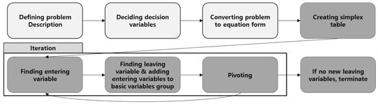 Linear programming used as a method in this paper can be solved by the simplex method. The simplex method can be utilized to solve linear programming []. The simplex method is based on forming the inverse of the basic matrix and updating the inverse []. That is, it is the repetition of searching for feasible solutions, calculating the value of the objective function, and comparing the derived value and the optimal value until finding the optimal solution. The process of the simplex is shown in Figure 2. First of all, all equations should be converted into standard equation form after inserting slack variables and create an initial simplex table. After this, find the entering variables. When solving the maximization problem, the variable with the largest absolute value of the coefficient becomes the entering variable. The next thing is to find leaving variable. To achieve this, the ration between entering variable and solution should be calculated. At this time, the variable with the lowest ration value becomes the leaving variable. After deciding on entering variable and leaving variable, the intersection point of the entering variable and leaving variable becomes the pivot element and all values of the row in the simplex table with the pivot element should be divided by the pivot element. The rest of the rows should be updated by using the new pivot row made previously. Lastly, if there is no new leaving variable, iterations terminate. If not, go back to the step of finding the entering variable. Various computer packages based on the simplex method were already developed. A developed mathematical model in the paper is also solved by one of the packages. The package used in the paper is CPLEX, which is the mathematical optimization software package. The version is 20.1.0. The darker parts in Figure 2 are processed by CPLEX.