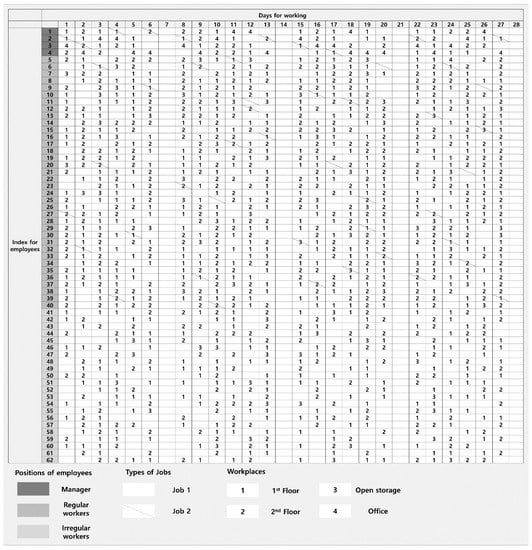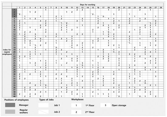 Unlike a staff schedule before applying a mathematical model, a derived staff schedule is more efficient. As shown in Figure 4, all constraints regarding work in the daytime are satisfied. For example, 45 employees are scheduled to work if looking at Day 1. In addition, job assignments are met as well. Continuing looking at Day 1, more than 15 employees are assigned on each floor and two of the employees conduct Job 2 as equipment supervisors. Furthermore, more than one manager is assigned on each floor to supervise other regular and irregular employees as well. Moreover, over two of the employees work at open storage and a manager works in an office. That is, the failure of employees’ assignments caused by a manager’s random employee assignment does not happen. Other days, as well as Day 1 meet all constraints for job assignments. Along with this, the 52-h workweek policy is well applied in the mathematical model as the result shows. There are no employees who come to work for more than five days a week. All employees have a day off on Sunday.
