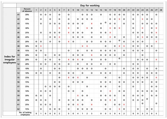 This paper provides a conservative and deterministic staff schedule by using a mathematical model that considers the average percent of irregular employees’ absences, which is an uncertain characteristic. Even though irregular employee absence is stochastic, the reason this paper derives a deterministic staff schedule is that it is impossible to predict if irregular employees come to work or do not come to work perfectly only based on the probability of each irregular employee’s absence. That is, even the result derived from the stochastic model cannot guarantee that each irregular employee follows a staff schedule without absences. However, the reason to perform the simulation after deriving a deterministic staff schedule is that it is meaningful in that it can give the result that can help managers respond to the irregular employee’s absence. Figure 6 is the result of the simulation. Row numbers from 41 to 62 mean irregular employees and column numbers mean days of work. In addition, O means that irregular employees come to work, and X means that irregular employees do not come to work. The result shows whether each irregular employee follows their schedule when considering each employee’s absence percent.