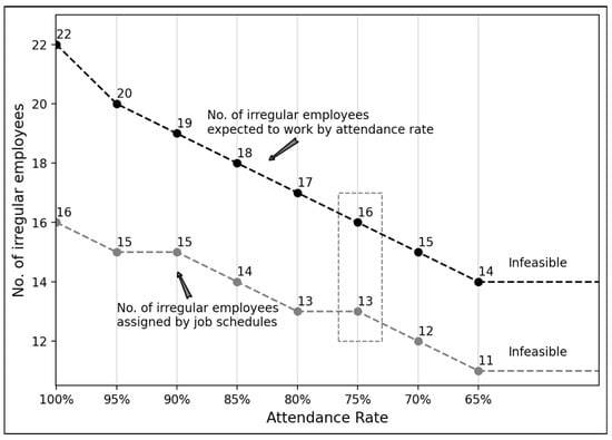 Furthermore, the purpose of the developed mathematical model is to minimize the total labor cost of regular and irregular employees. This means that the result in the numerical experiment is for a company that has a priority of saving the total labor cost. Therefore, if looking at the result in Figure 4, as many irregular employees as possible are scheduled on each workday even though the average percent of irregular employee absence is considered. It is more advantageous for a company to minimize the total labor costs by using as many irregular employees as possible out of 22 irregular employees due to relatively low labor costs. However, it is seen that as many irregular employees as possible are not used. This is because there are rules on conducting jobs for a company and there are jobs that can be conducted by regular employees. A company allocates overtime work by assigning only regular employees to jobs for consideration for regular employees as well. To conduct overtime work, regular employees should work during the daytime. Thus, the result in Figure 4 is derived, even though a company has enough irregular employees that can cover more jobs.