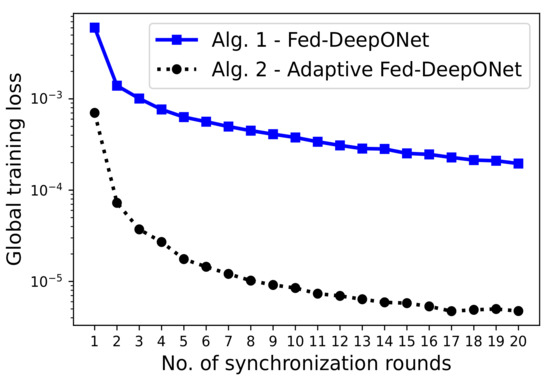 Figure 2 depicts the results of applying federated training using Algorithm 1 and Algorithm 2. Notice that, as expected, the training convergence of Fed-DeepONet is poor compared to the training convergence of the Adaptive Fed-DeepONet. We remark that this result is not new. In centralized deep learning [27], even though most of the theoretical results are developed for stochastic gradient descent (SGD), one often uses adaptive versions of SGD in practice. These adaptive methods generally deal better with the non-convex nature of the loss function and training dynamics. These results motivate us to only employ the Adaptive Fed-DeepONet to demonstrate the proposed framework’s performance.