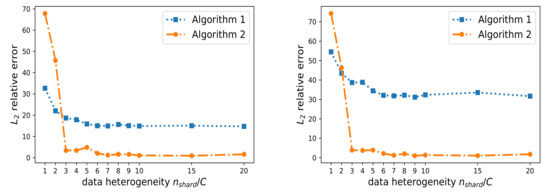 In the first experiment, we modify the amount of data heterogeneity as follows. Consider the centralized dataset with N data triplets . We sort this dataset according to the target operator values (i.e., from smallest to largest). Then, we divide the sorted dataset into blocks/shards (for simplicity, we let ). We then assign to each of the clients blocks for sampling data. Notice that as the value of increases, the federated dataset becomes more independent and identically distributed. This is because the clients can get data from multiple blocks, making the data samples more diversified. As a result, the densities and become more statistically alike. On the other hand, as the value of decreases, the data heterogeneity increases. In particular, for this simple experiment, the data heterogeneity reaches its maximum when .