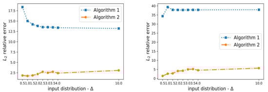 Figure 6 (left) (resp. Figure 6 (right)) depicts the mean relative error for 100 in-distribution (resp. the out-of-distribution) trajectories when we vary the functional input data heterogeneity (i.e., we increase ). The results illustrate that as we increase the input data heterogeneity (i.e., as we increase ), the performance of the proposed adaptive Fed-DeepONet (Algorithm 2) does not deteriorate. Such a result shows that Algorithm 2 is robust against changes in the input distribution. Note also that Algorithm 1 is also not affected by the increase in data heterogeneity. The performance of Algorithm 1, however, is not acceptable.
