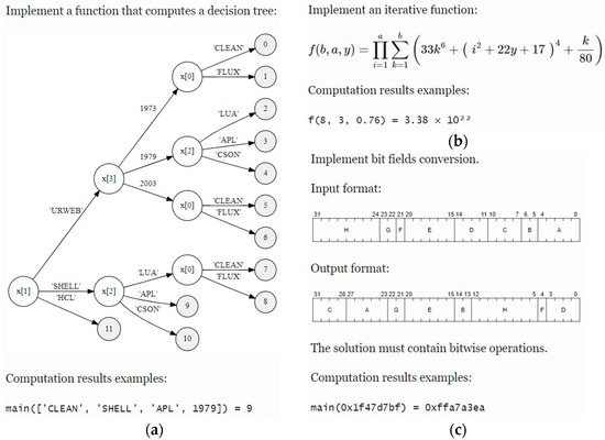 Examples of formulations for unique programming tasks of various types (see Table 1) automatically generated [6] by the DTA system [9,10]: (a) implement a decision tree, (b) implement an iterative function, (c) implement bit fields conversion.
