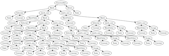 The source code vectorization problem might be reduced to the development of a mapping , where denotes the set of program texts, and denotes the dimensionality of the target vector space. The vectorization algorithm used in DTA first constructs an AST for every program text using the AST module from the Python standard library. Then, nodes belonging to the set {Import, Load, Store, alias, arguments, arg, Module, keyword} are removed from the AST. The resulting AST of a program that solves one of the automatically generated tasks of type 6 (see Table 1, see Figure 1a) using a pattern matching-based approach is shown in Figure 2. The AST visualization was obtained using the graphviz library [37].