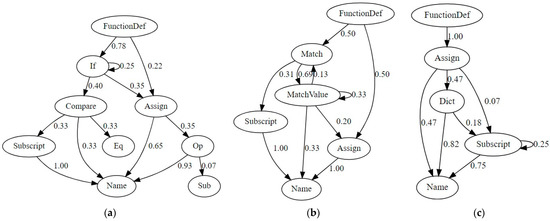 Assuming the fact that the unique task generators used in DTA are based on probabilistic grammars [6,10], the AST of each program text is then transformed into a Markov chain state transition graph . A Markov chain is a model describing a sequence of events , where the probability of event , , only depends on the state attained on the previous event [38]. In a Markov chain graph, vertices represent types of AST nodes, edges represent transitions between AST nodes, and weights of edges denote transition probabilities. While constructing a Markov chain state transition graph for every AST of each program text , a number of AST node replacements listed in Table 2 are performed depending on task type.