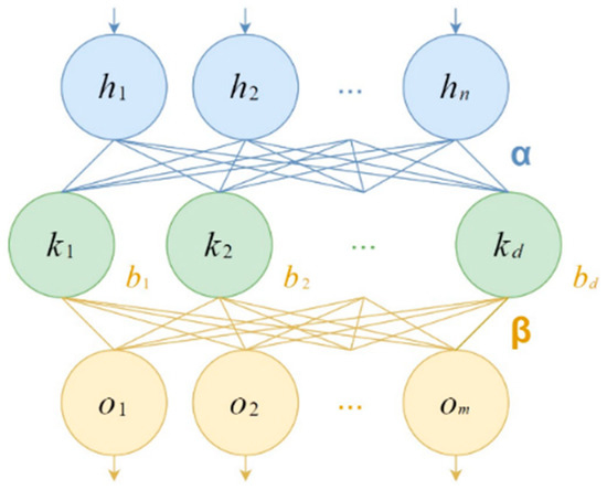The structure of the ELM adopted for classification is shown in Figure 4. The weights of connections among neurons in ELM can be modeled as two matrices, and . Cells of the matrix represent weights of connections among input neurons and hidden neurons , so . Cells of the matrix are initialized randomly, as well as hidden layer biases (see Figure 4).
