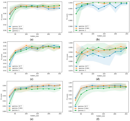 ELM (see Algorithms 3 and 4) hyperparameter selection for classification of program texts solving automatically generated tasks of various types (see Table 1): (a) task of type 6; (b) task of type 7; (c) task of type 8; (d) task of type 9; (e) task of type 10; (f) task of type 11.