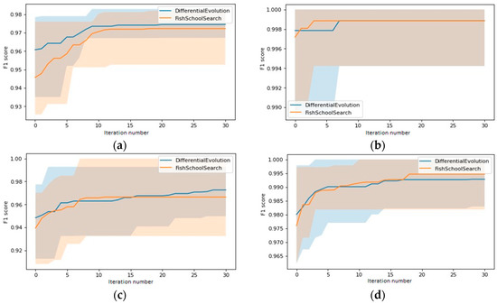 Aiming to stabilize and further enhance the performance of the fastest classification algorithm, we applied differential evolution (DE) [29] and fish school search with exponential step decay (ETFSS) [50] to ELM input weights and hidden biases fine-tuning by maximizing the Macro F1 score (10). The reasoning behind choosing these algorithms is described in Section 4.6. The experimentally selected parameters of the considered biology-inspired algorithms are listed in Table 6. The plots illustrating the convergence of the DE and ETFSS algorithms improving ELM performance in tasks with most diverse solutions are shown in Figure 6. The comparison of ELM with ELM models fine-tuned with DE (DELM) and with ELM models fine-tuned with ETFSS (FELM) is shown in Table 7.