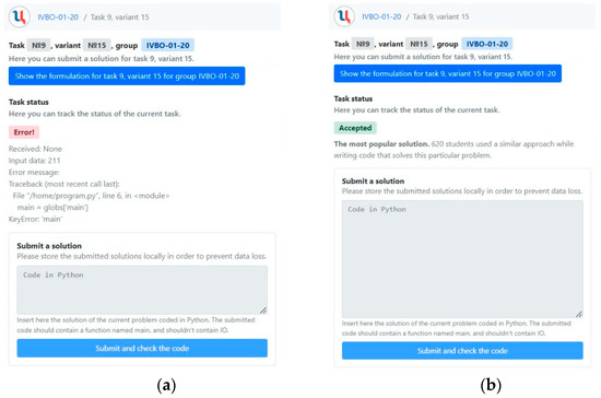 The most accurate ELM-based classifiers obtained with biology-inspired algorithms (see Table 7 and Figure 6) were incorporated into the DTA system for real-time analysis of student submissions. The sample web-based UI of the DTA web app [9] is shown in Figure 7. The sample classifier decision is shown in Figure 7b. Such classifiers also enable real-time analysis of student submissions by teachers, allowing programming instructors to discover the most common approaches used by students while solving automatically generated programming exercises during the semester. This allows filling the gaps in students’ knowledge by explaining the least frequently used language features of the Python programming language.
