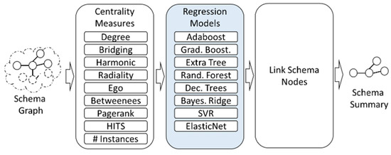 - We model the problem of selecting the top-k most important nodes as a regression problem. For each schema node we construct a set of features based on multiple centrality measures and the corresponding number of instances available for that schema node. Then we search for their optimal combination to maximize the quality of the generated summary. We explore eight ML algorithms, (i.e., Adaboost, Gradient Boosting, Extra Tree, Random Forest, Linear, Decision Tree, Bayesian Ridge, and ElasticNet regressors) identifying the best performing one.