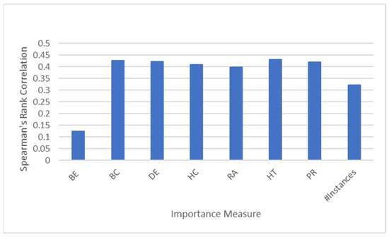 Spearman’s rank correlation for all datasets, for the various importance measures with the golden standard ranking.