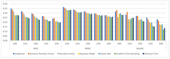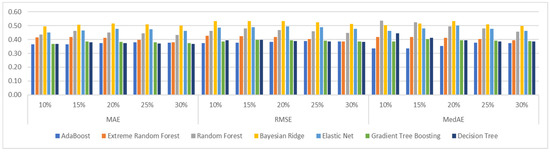 Table 6 presents a part of the confusion matrix where we can see the true positives (TPs) that the various ML algorithms predict. As shown Decision Tree regressor makes the best predictions on the true positives (TP) in most of the cases (10%, 15%, 20%, 25%, 30%). Adaboost Regressor has also a good performance in selecting the TPs however it is not the best performer overall as seen also in Figure 4.