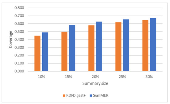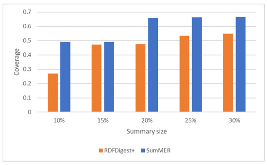 As shown, in both datasets SumMER can achieve a higher coverage than RDFDigest+ in all cases, always improving the coverage of the result summary.