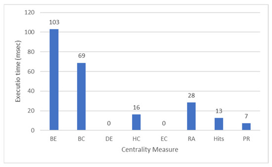 Calculating individual centrality measures. The average execution time for identifying the most important nodes on our largest test dataset (DBpedia v3.8) is shown in Figure 9 for the various centrality measures.
