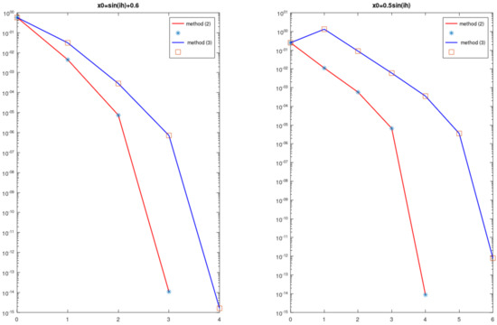 Figure 1 shows at each iteration. The results are obtained for and . The starting approximations were given by formulas (for the graphs on the left) and (for the graphs on the right). Notice that the method (2) convergences faster than (3) for both problems.