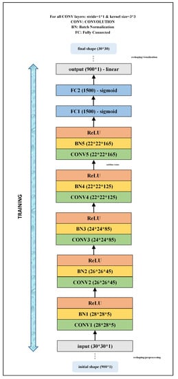 An optimum CNN architecture was developed with five convolutional layers and two FC layers (Figure 2). The kernel numbers in the convolutional layers (referred to as CONV1 to CONV5) were 5, 45, 85, 125, and 165, respectively. Padding was set to ‘same’ only in CONV5 to prevent the size from changing. A 3 × 3 kernel size and 1 × 1 stride were applied to all convolutional layers, providing those layers with sizes 28 × 28, 26 × 26, 24 × 24, 22 × 22, and 22 × 22, respectively. A batch normalization layer (referred to as BN1 to BN5) followed CONV1 to CONV5, without changing size. Normalization of the input layer makes the CNN converge more quickly to outputs that collectively average nearly zero with a standard deviation of nearly one. The layers FC1 and FC2 contain 1500 neurons. The ReLu activation function was applied to CONV1 to CONV5, whereas the sigmoid activation function was applied to FC1 and FC2, with a linear transformation applied to generate the output layer.