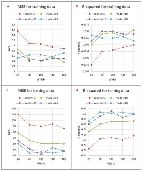 Figure 3c,d display the FNO results for the testing subset. The model with modes of 5 generated the poorest prediction performance, i.e., highest MSE and lowest R. As width increased (with modes held at 5), MSE decreased from 109.9231 to 86.3347 and R increased from 0.7661 to 0.8163. When the number of modes was increased to 10, the FNO performance improved. Additionally, an increase in width had a positive effect on accuracy when modes were held at 10. The model with performed better than models with modes of 5 or 10, as it generated MSE and R displaying ranges of 42.1611–65.5664 and 0.8605–0.9103, respectively. In general, the prediction performance of the FNO model with modes of 20 overlapped with that of modes of 15. Considering all twenty cases, the model with and generated the best performance with an MSE of 1.4087 and R of 0.997 for the training subset, and an MSE of 42.1611 and R of 0.9103 for the testing subset. In addition to the graphical comparisons (Figure 3), the MSE and R values achieved by all FNO cases evaluated are listed in Table 1.