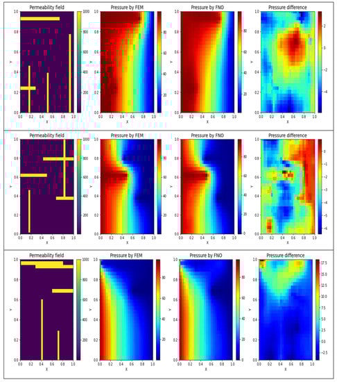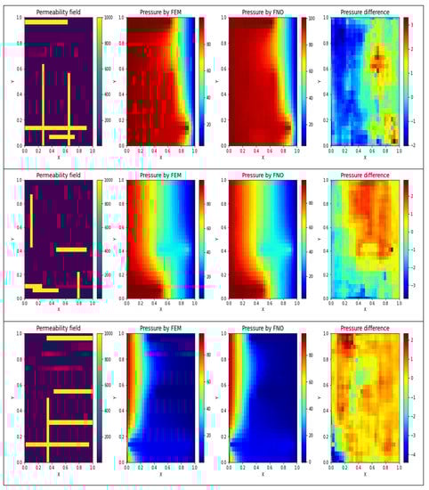 In order to improve visualization of the pressure changes occurring over the defined shapes, three examples are illustrated for selected training (Figure 4) and testing (Figure 5) subsets. The plots in the left-side columns display the permeability fields, for representative sample grids. The plots in the left-central columns display the pressure distribution derived by FEM (considered to be true distribution). The plots in the right-central columns display the predicted pressure distributions of the best-performing FNO model developed. The plots in the right-side columns display the pressure difference between the FEM and FNO outputs []. Generally, there was a very close match between the true pressure distributions and those predicted by the FNO model, especially for the training dataset.