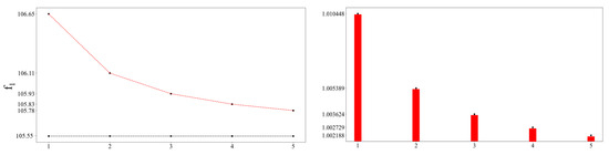 In order to determine the convergence rate of the solution of Equation (1) with the Dirac delta distribution formulation, both Laguerre and Householder-QR algorithms are tested as the size of the system matrix increases. Specifically, the ratio , is examined, where is the eigenfrequency recovered by either algorithm for a system matrix of size with is the exact value. Thus, the left column in Figure 3 plots the values of the first four eigenfrequencies recovered by the aforementioned algorithms (in red color), concurrently with the analytical solution (in black color) for a nearly zero mass ratio of . At the same time, the left column in Figure 3 plots the rate of convergence as the number increases. Similarly, Figure 4 plots the same information, but for a substantial mass ratio of . In both cases, the rate of convergence is satisfactory and after N = 5 terms, the error is negligible. Note that both algorithms give the same ratio for size , past which the Laguerre is no longer accurate and only the Householder-QR algorithm is used.