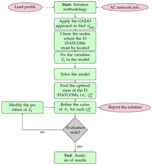 Section 3 presents the proposed solution method, which is based on the GNDO and the successive approximations power flow approach, with the aim of determining the nodes where the D-STATCOMs must be located as well as their sizes. These nodes are also used as inputs for the ORPF formulation to reach additional reductions in the objective function value.