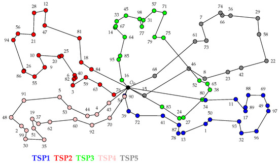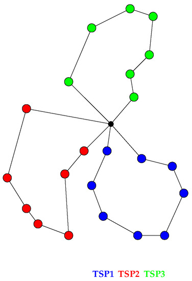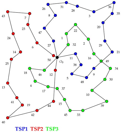 - Soylu, B. A general variable neighborhood search heuristic for multiple traveling salesmen problem. Comput. Ind. Eng. 2015, 90, 390–401. [Google Scholar] [CrossRef]